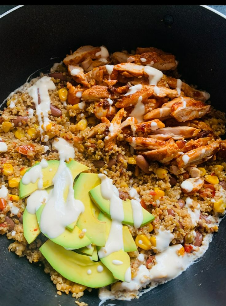 7. Serve the bowl up - first the quinoa, topped with chicken, avocado and sour cream. Sprinkle a little chilli powder, chopped coriander leaves, squeeze of lime over the top for some extra zing (optional).